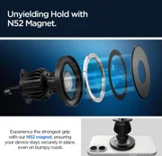 Οι ενσωματωμένοι μαγνήτες κλάσης N52 παρέχουν εξαιρετικά ισχυρό κράτημα που διατηρεί το smartphone σταθερό ακόμη και κατά τη διάρκεια ξαφνικών ελιγμών ή οδήγησης σε ανώμαλες επιφάνειες. Η βάση στήριξης προσφέρει ευελιξία χάρη στον περιλαμβανόμενο μεταλλικό δακτύλιο, ο οποίος επιτρέπει επίσης τη χρήση της με τηλέφωνα που δεν είναι MagSafe. Ο περιστρεφόμενος κατά 360 μοίρες σχεδιασμός σάς επιτρέπει να ρυθμίζετε τη γωνία θέασης όπως επιθυμείτε, εξασφαλίζοντας μέγιστη άνεση και ασφάλεια κατά την οδήγηση.