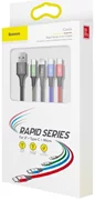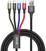 Το καλώδιο υψηλής ποιότητας σας επιτρέπει να φορτίζετε γρήγορα και εύκολα τέσσερις συσκευές ταυτόχρονα - δύο με υποδοχές Lightning και μία με υποδοχές USB-C και Micro USB. Επιπλέον, ένα καλώδιο Lightning υποστηρίζει τη μεταφορά δεδομένων. Κάθε καλώδιο έχει διαφορετικό χρώμα, ώστε να μπορεί εύκολα να διακριθεί. Το καλώδιο υποστηρίζει φόρτιση έως 3,5 A (max 2 A ανά καλώδιο) και είναι ευέλικτο χάρη στην ευρεία συμβατότητά του. Οι άκρες αλουμινίου είναι πολύ ανθεκτικές και το πλεκτό νάιλον μανίκι είναι ανθεκτικό σε ζημιές και τριβή και επίσης αποτρέπει την εμπλοκή. Η συμπεριλαμβανόμενη σύνδεση καλωδίων διευκολύνει την αποθήκευση και την οργάνωση του καλωδίου.