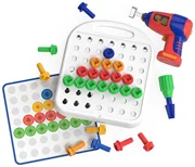 Με το τρυπάνι/κατσαβίδι, το παιδί μπορεί να συνδέσει πολύχρωμες βίδες σε μια ειδική πλακέτα για να δημιουργήσει τα δικά του σχέδια, σχήματα και εικόνες, γεγονός που συμβάλλει στην ανάπτυξη της δημιουργικότητας και της φαντασίας. Η δυνατότητα πειραματισμού με διαφορετικά σχέδια βοηθά στην ανάληψη των προκλήσεων της κατασκευής και της λογικής σκέψης. Επιπλέον, η χρήση εργαλείων παιχνιδιών επιταχύνει την ανάπτυξη των κινητικών δεξιοτήτων, διευκολύνοντας το νήπιο να δέσει κορδόνια και να κρατήσει ένα μολύβι.