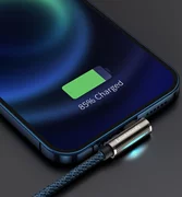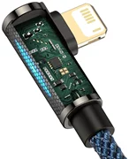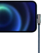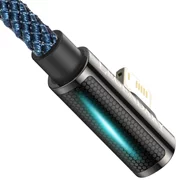 Το καλώδιο είναι κατασκευασμένο από υλικά υψηλής ποιότητας, κράμα ψευδαργύρου, το οποίο είναι ανθεκτικό σε βλάβες και οξείδωση, και ανθεκτικό νάιλον. Οι αγωγοί χαλκού εξασφαλίζουν σταθερή και γρήγορη φόρτιση. Ο σχεδιασμός 90° διευκολύνει τη χρήση της συσκευής κατά τη φόρτιση, ενώ μια μπλε ένδειξη δείχνει τη διαδικασία φόρτισης και θα σας βοηθήσει να εντοπίσετε το καλώδιο όταν σκοτεινιάσει.