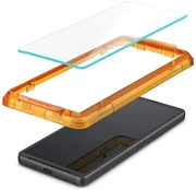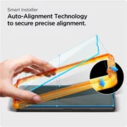 Το σκληρυμένο γυαλί από τη σειρά "AlignMaster" της Spigen έχει στερεωθεί με ένα πλαίσιο τοποθέτησης τέλεια κομμένο στο μπροστινό μέρος του τηλεφώνου, χάρη στο οποίο μπορείτε να το τοποθετήσετε τέλεια στην οθόνη. Ο κατασκευαστής έχει απλοποιήσει τη διαδικασία τοποθέτησης σε τέτοιο βαθμό ώστε να είναι πλήρως διαισθητική για κάθε χρήστη.