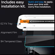 Το σκληρυμένο γυαλί από τη σειρά "EZ Fit" της Spigen ασφαλίζεται με ένα πλαίσιο τοποθέτησης τέλεια κομμένο στο μπροστινό μέρος του τηλεφώνου, χάρη στο οποίο μπορείτε να το τοποθετήσετε τέλεια στην οθόνη. Ο κατασκευαστής έχει απλοποιήσει τη μέθοδο τοποθέτησης σε τέτοιο βαθμό ώστε να είναι πλήρως διαισθητική για κάθε χρήστη.