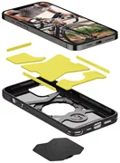 Η βασική πτυχή αυτής της υπόθεσης, ωστόσο, είναι μια ειδική εγκοπή στην πλάτη της. Πρόκειται για ένα σύστημα τοποθέτησης για βάσεις ποδηλάτων Spigen MF100 ή MS100, οι οποίες αποτελούν αναπόσπαστο μέρος του συστήματος Gearlock. Η εγκατάσταση πραγματοποιείται περιστρέφοντας τη συσκευή με το κάλυμμα 45° προς τα αριστερά ή προς τα δεξιά, ώστε να μπορούμε να χρησιμοποιήσουμε τη συσκευή οριζόντια ή όρθια. Η θήκη είναι εξαιρετικά λεπτή για τέτοιες πλούσιες ιδιότητες και λειτουργικότητα.