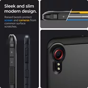 Η ελαφρώς ανυψωμένη μορφή της θήκης γύρω από την κάμερα και την οθόνη την προστατεύει από γρατζουνιές, ανυψώνοντας το τηλέφωνο ακριβώς πάνω από την επίπεδη επιφάνεια. Διαθέτει καλύμματα κουμπιών και εγκοπές για λιμάνια.