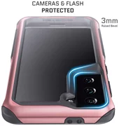 Your Galaxy S21 will not only look great but be covered by the military-grade protection of the case’s metal cover. The multi-layer design combines a TPU soft layer with an ultra-durable aluminum metal frame. Together they provide advanced R7x shock absorbing technology which will help your phone easily survive everyday drops and falls. The Galaxy S21 phone case is also, of course, scratch-resistant to keep it looking as good as new. Two of the standout features of the Galaxy S21 5G are the phone’s incredible display and camera setup. You can protect both with our state-of-the-art phone cover. On the front, the 3mm raised bevel helps protect the Galaxy S21 amazing dynamic AMOLED 2X adaptive display from cracks or scratches. On the back, the camera lens bumper will keep the Galaxy S21 camera lens and flash in pristine condition.