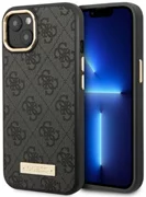 Συλλογή Guess 4G Logo Plate MagSafe από τη συλλογή κάτω από το σήμα κομψότητας που τελειώνει με ένα χρυσό έμβλημα λογότυπου Guess.