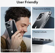 Η ελαφρώς υπερυψωμένη μορφή της θήκης γύρω από την κάμερα την προστατεύει από γρατσουνιές, ανυψώνοντας το τηλέφωνο λίγο πάνω από την επίπεδη επιφάνεια. Η θήκη διαθέτει καλύμματα κουμπιών και εγκοπές θυρών.