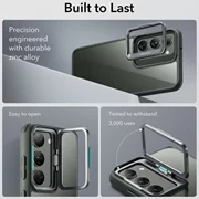 Εκτός από το τυπικό υπερυψωμένο κάλυμμα γύρω από τους φακούς, η θήκη είναι επιπλέον εξοπλισμένη με ένα μεταλλικό πλαίσιο ανοίγματος που μπορεί εύκολα να μετατραπεί σε λειτουργική βάση. Διαθέτει καλύμματα κουμπιών και εγκοπές για τις θύρες.