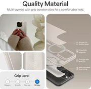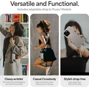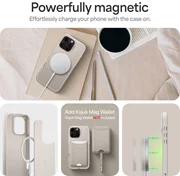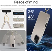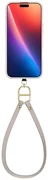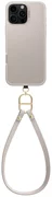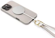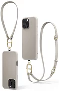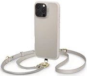 "Κρεμ MagSafe με ρυθμιζόμενο μαύρο λουράκι από PU δέρμα και χρυσές λεπτομέρειες. Ανακυκλωμένο TPU, συμβατό με iPhone 16 Pro. Στυλάτη και φιλική προς το περιβάλλον."