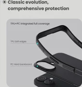 Η θήκη είναι κατασκευασμένη από δύο υλικά: άκαμπτο PC (πολυανθρακικό) και μαλακό TPU, τα οποία μαζί προσφέρουν εξαιρετική προστασία. Το άκαμπτο πλαστικό PC προστατεύει το τηλέφωνο από μηχανικές ζημιές, ενώ οι εύκαμπτες άκρες TPU απορροφούν τους κραδασμούς, καθιστώντας τη θήκη ιδανική για την προστασία του iPhone από πτώσεις. Πρόσθετα προστατευτικά στις γωνίες ενισχύουν την προστασία και παρέχουν πρόσθετη απορρόφηση.